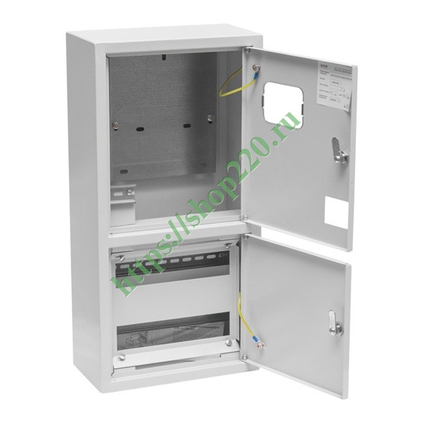 Металлический корпус ЩУРн от производителя EKF относится к серии учетно-распределительных шкафов PROxima и представляет собой сварную конструкцию, состоящую из двух отсеков. С его помощью осуществляется ввод, учет и распределение энергии, а также защита сети от перегрузок тока и коротких замыканий. Данная модель шкафа оснащена 2 дверьми сплошного типа, запирающимися на почтовый замок. В нижнем отсеке размещаются модульные устройства на DIN-рейках в количестве 27 единиц, 3 из которых являются выносными под пломбу. Верхний отсек оснащен монтажной платой из стали размером 250х208 мм, на которой фиксируется трехфазный электросчетчик, показания которого снимаются через смотровое окно в двери. Номинальное значение токовой нагрузки не должно превышать 125 Ампер при напряжении сети 230-400 Вольт. Оболочка сделана из стали толщиной 0.8 мм, которая обеспечивает степень защиты IP31 что гарантирует от попадания твердых объектов и вертикально падающих капель. Она имеет покрытие светло-серого цвета RAL 7035 в виде атмосферостойкой порошковой краски.