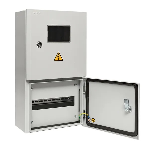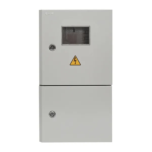 Учетный щит ЩУ серии Basic от известной компании EKF представляет собой корпус наружной установки с двумя секциями, предназначенный для ввода и учета электроэнергии. Серия щитов Basic является бюджетным вариантом, аналогичным линейке PROxima, которая имеет базовую комплектацию. Оболочка сделана сварным методом из листовой стали толщиной 0.7 мм и обеспечивает жесткость и надежное соединение частей. Высокая степень защиты IP54 предотвращает попадание пыли и влаги внутрь корпуса. Для обеспечения дополнительной защиты шкаф имеет две сплошные двери с углом открывания 120 градусов, запирающейся на замок и имеющей по внутреннему периметру герметичный уплотнитель. Отличительной особенностью модели является наличие прозрачного окошка в двери для снятия показаний счетчика. Внутреннее пространство бокса оснащено DIN-рейками для размещения модульного оборудования в количестве 12 единиц и монтажной панелью 250х208 мм для установки электросчетчика. Номинальная величина тока для встраиваемых устройств не должна превышать 125 Ампер при напряжении сети 230-400 Вольт. Покрытие корпуса имеет светло-серый цвет RAL 7035 в виде порошковой краски, обладающей антикоррозийным эффектом. Для подключения кабелей предусмотрены отверстия снизу корпуса. Щит может быть размещен на открытом воздухе под навесом на плоской поверхности или на столбе с применением специального монтажного комплекта.