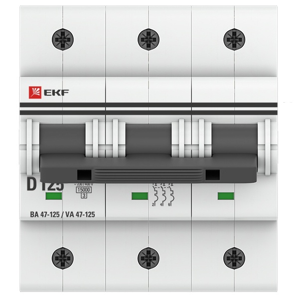 Модульный трехполюсный автоматический выключатель ЕКФ током нагрузки 125А, характеристикой D, током КЗ 15кА mcb47125-3-125D