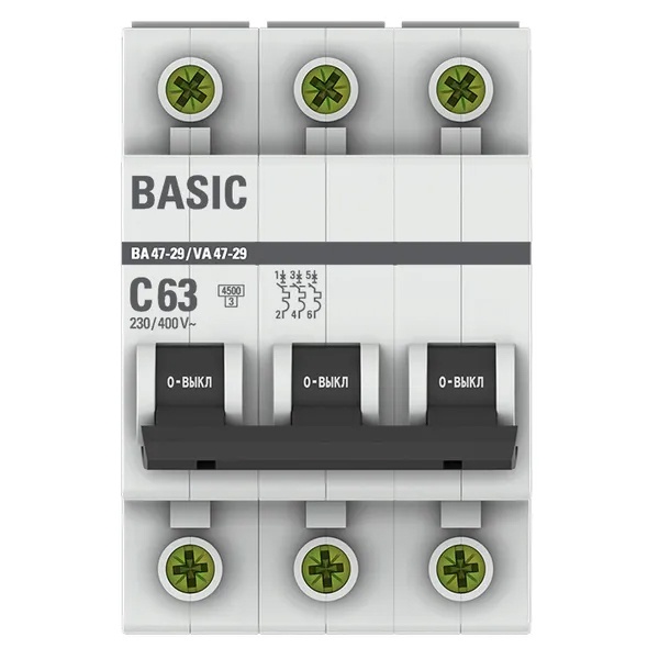 Автоматический выключатель EKF Basic ВА 47-29 3P 63А (C) 4,5кА (автомат электрический) mcb4729-3-63C
