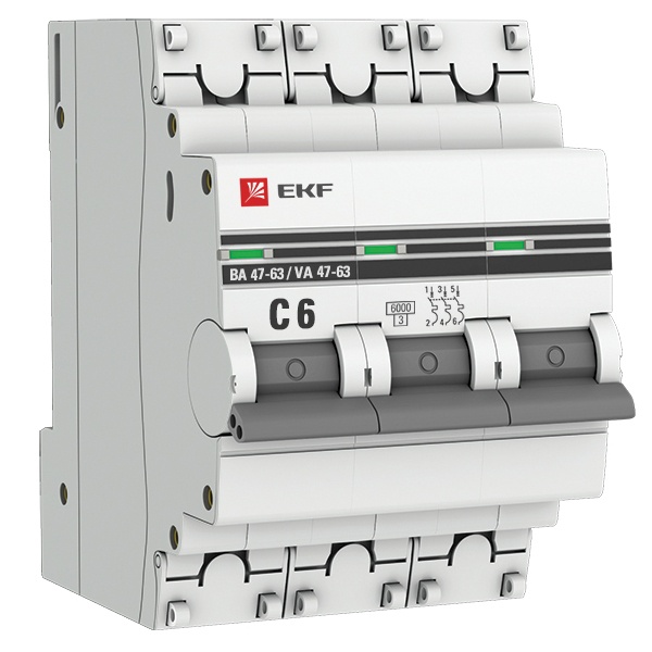 Известная компания EKF PROxima представляет серию модульного оборудования ВА47-63, к которой относится автоматический выключатель, который представляет собой механическое коммутационное устройство. Оно монтируется в распределительные щиты частного или многоквартирного дома, а также в административных и промышленных зданиях. Его основная функция состоит в защите цепи от короткого замыкания или токов перегрузки. Токоограничивающее устройство имеет 3 полюса и рассчитано на напряжение сети переменного тока 230/400 Вольт. Номинальный ток с защитной характеристикой C составляет 6 Ампер. Автомат такого типа применяется для стандартной защиты цепей розеток и освещения. Отключающая возможность устройства составляет 6 килоампер. Это сила тока короткого замыкания, при которой оборудование может многократно отключаться, не выходя из строя. Механическая износостойкость составляет 20 000 циклов, коммутационная – 10 000 циклов. Внешне автоматический выключатель заключен в корпус, который усилен дополнительными заклепками. Винтовые зажимы закрыты пластиковыми крышками для опломбировки, что исключает несанкционированный доступ к устройству. На лицевой стороне имеется удобная рукоятка управления, а также цветовая индикация состояния. Габаритные параметры: 54х80х72 мм.