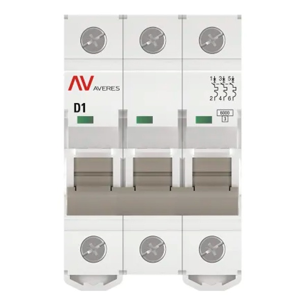 Модульный электрический автомат переменного тока, трехполюсный на 1 Ампер с расцепителем типа D, коммутационная отключающая способность 6кА, ЕКФ Averes mcb6-3-01D-av