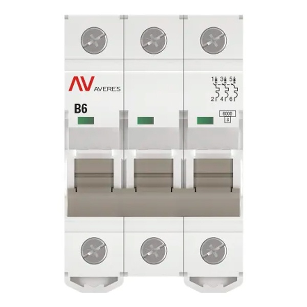 Модульный электрический автомат переменного тока, трехполюсный на 6 Ампер с расцепителем типа B, коммутационная отключающая способность 6кА, ЕКФ Averes mcb6-3-06B-av