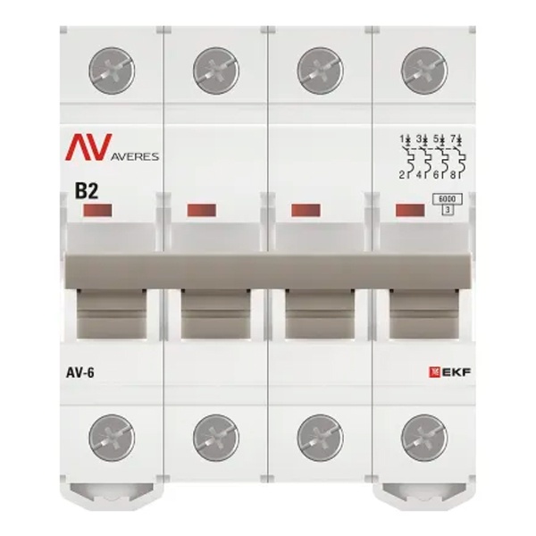Модульный электрический автомат переменного тока, четырехполюсный на 2 Ампера с расцепителем типа B, коммутационная отключающая способность 6кА, ЕКФ Averes mcb6-4-02B-av