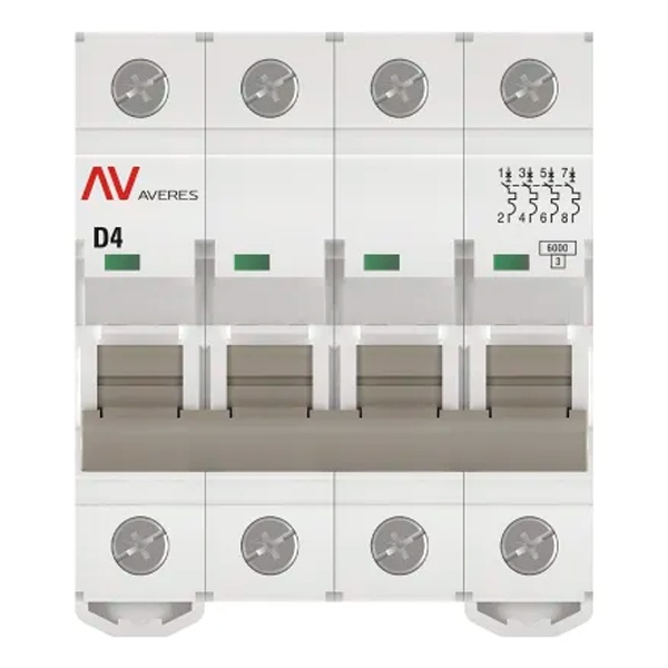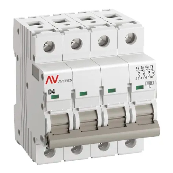 Модульный электрический автомат переменного тока, четырехполюсный на 4 Ампера с расцепителем типа D, коммутационная отключающая способность 6кА, ЕКФ Averes mcb6-4-04D-av