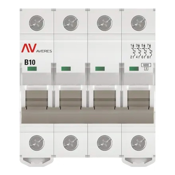 Модульный электрический автомат переменного тока, четырехполюсный на 10 Ампер с расцепителем типа B, коммутационная отключающая способность 6кА, ЕКФ Averes mcb6-4-10B-av