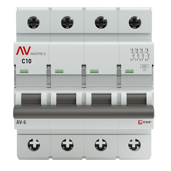 Модульный электрический автомат, четырехполюсный на 10 Ампер с расцепителем типа C, отключающая способность 6кА, ЕКФ Averes mcb6-4-10C-av