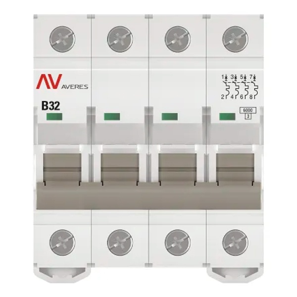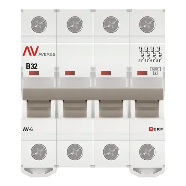 Модульный электрический автомат переменного тока, четырехполюсный на 32 Ампера с расцепителем типа B, коммутационная отключающая способность 6кА, ЕКФ Averes mcb6-4-32B-av