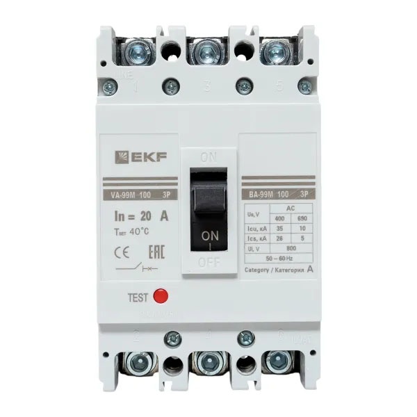 Силовой трехполюсный автоматический выключатель серии ВА-99М-100, ток нагрузки 20 Ампер с отключающей способностью 35кА, ЕКФ. mccb99-100-20m