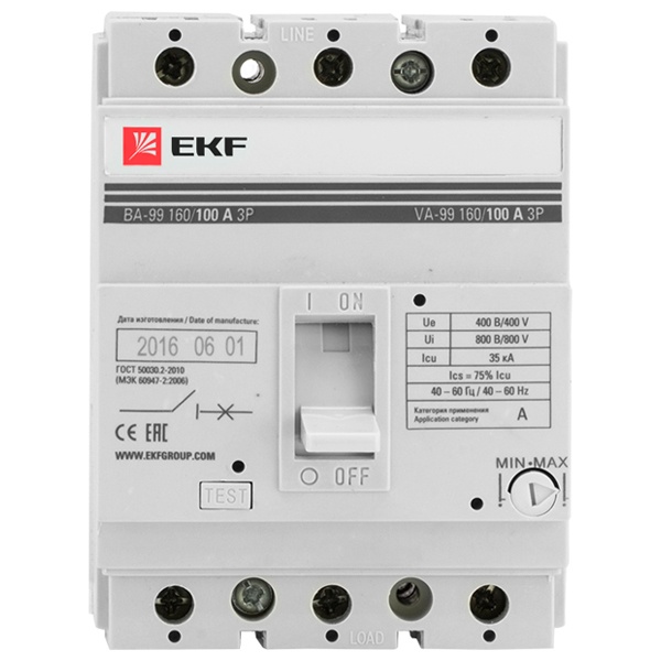 Серия автоматических выключателей ВА-99 от производителя EKF представляет модель устройства в литом корпусе с регулируемым термомагнитным расцепителем в диапазоне 0,8-1ln. Этот автомат предназначен для нечастых оперативных включений и отключений тока в обычном режиме, а также для защиты распределительных сетей и электродвигателей от токов перегрузки и коротких замыканий. Аппарат имеет 3 полюса. Он обладает отключающей способностью 35 кАмпер при допустимом рабочем напряжении сети 400 Вольт переменного тока. Он крепится на монтажную пластину распределительного щита на объектах гражданского или производственного назначения. Предельная величина тока расцепителя составляет 80 Ампер. Автомат выполнен в виде моноблока из термостойкой пластмассы и оснащен рычагом управления с 3 режимами: включение, срабатывание и отключение, а также тестовой кнопкой для проверки механизма отключения аппарата. При установке под лицевой панелью все токоведущие части недоступны для прикосновения, чем обеспечивается электробезопасность. В комплект поставки входят межфазные перегородки, монтажные болты и паспорт. На корпусе предусмотрено место для присоединения дополнительных устройств.