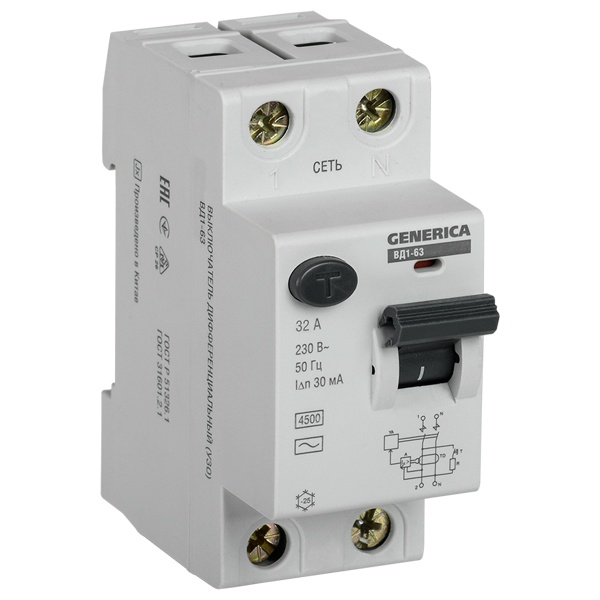 УЗО Generica (ИЭК) ВД1-63 2Р 32А 30мА тип AC (ВДТ) MDV15-2-032-030