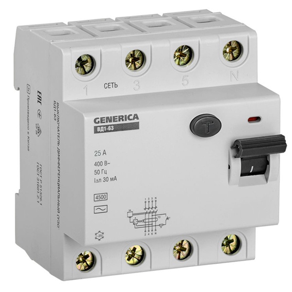 Трехфазный модульный выключатель дифференциального тока Generica ВД1-63, ток нагрузки 25А, ток утечки 30мА тип АС MDV15-4-025-030