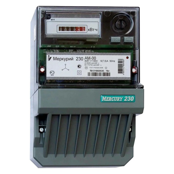 Электросчетчик Меркурий-230 AM-00 5-7,5А 57,7/100В — однотарифный трехфазный счетчик активной электроэнергии трансформаторного включения для коммерческого и технического учета. Модель предназначена для работы в сетях переменного тока 3х57,7/100 В и применяется совместно с измерительными трансформаторами тока (ТТ), что делает ее удобной для объектов с повышенными нагрузками и распределительных щитов, где прямое включение счетчика не используется.