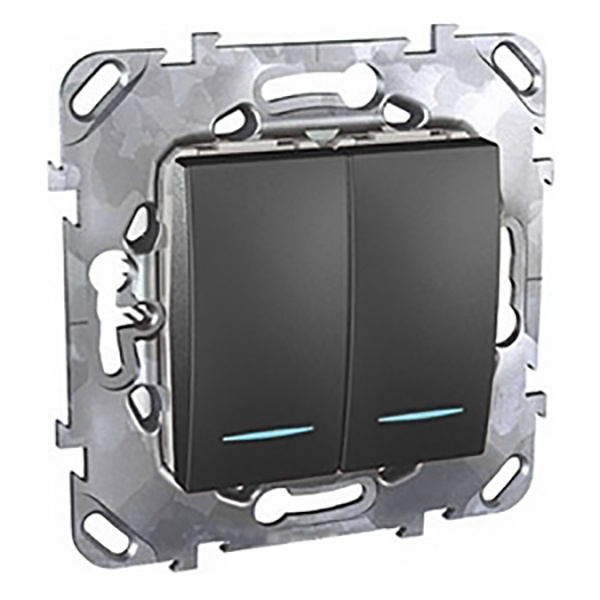 Переключатель двухклавишный Schneider Electric UNICA ТОР (графит) с подсветкой предназначен для сетей до 250 В на ток до 10 А.- 2 переключающих контакта.- Подсветка делает переключатель легко находимым в отсутствие освещения.- Переключатель позволяет управлять одним источником света из двух точек.