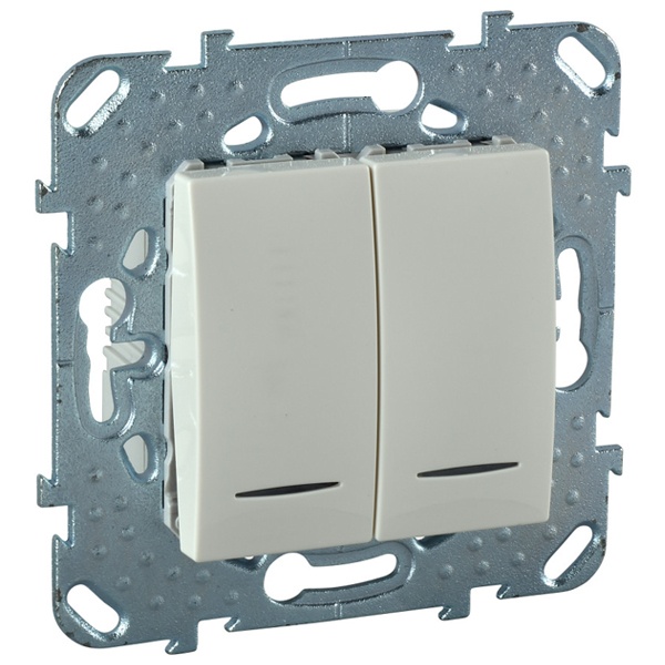 Переключатель двухклавишный Schneider Electric UNICA (бежевый) с подсветкой предназначен для сетей до 250 В на ток до 10 А. - 2 переключающих контакта. - Подсветка делает переключатель легко находимым в отсутствие освещения. - Переключатель позволяет управлять одним источником света из двух точек.