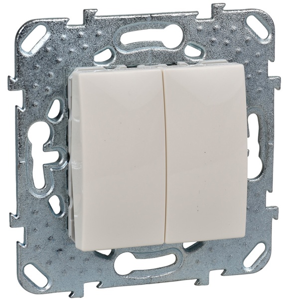 Переключатель двухклавишный Schneider Electric UNICA (бежевый) без подсветки предназначен для сетей до 250 В на ток до 10 А. - 2 переключающих контакта. - Специальные направляющие для облегчения ввода кабеля. - Переключатель позволяет управлять одним источником света из двух точек.