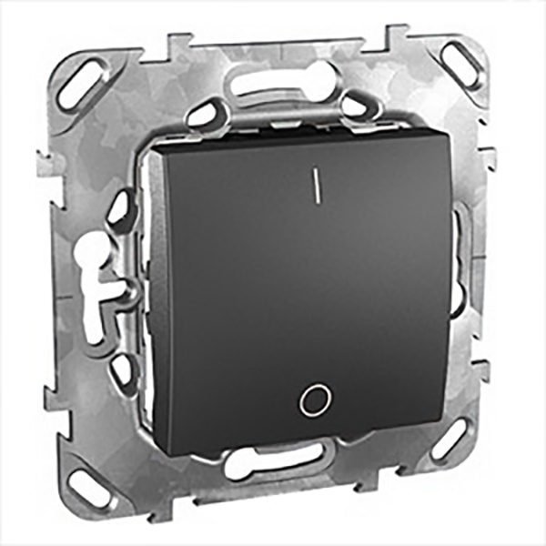 Выключатель одноклавишный Schneider Electric UNICA ТОР (графит) двухполюсный с индикацией, с винтовыми клеммами предназначен для сетей до 250 В на ток до 16 А. - 1 нормально открытый контакт. - Специальные направляющие для облегчения ввода кабеля. - Увеличенные разделители для исключения возможности короткого замыкания.