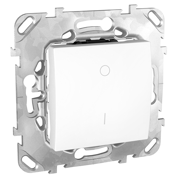 Выключатель одноклавишный Schneider Electric UNICA (белый) двухполюсный с индикацией, с винтовыми клеммами предназначен для сетей до 250 В на ток до 16 А. - 1 нормально открытый контакт. - Специальные направляющие для облегчения ввода кабеля. - Увеличенные разделители для исключения возможности короткого замыкания.