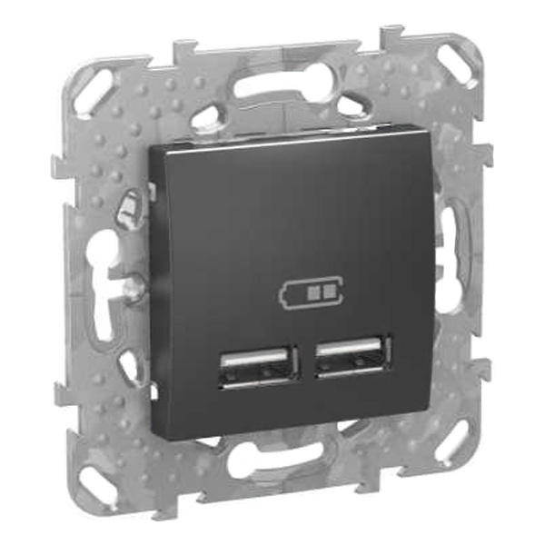 Розетка USB Schneider Electric UNICA ТОР (графит) с двумя разъёмами предназначена для сетей до 5 В постоянного тока и максимальный ток нагрузки 2,1 А.