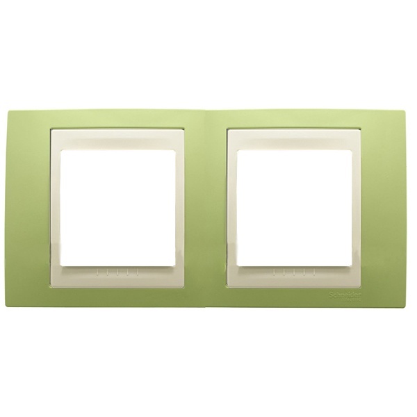 Рамка Schneider Electric UNICA ХАМЕЛЕОН (зелёное яблоко) двухместная с бежевой декоративной вставкой.