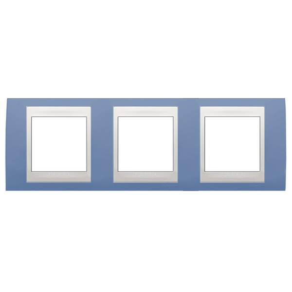Рамка Schneider Electric UNICA ХАМЕЛЕОН (голубой лёд) трёхместная с белой декоративной вставкой.