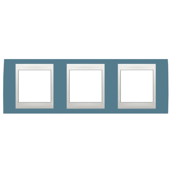 Декоративная горизонтальная 3-постовая цветная рамка для механизмов Unica, цвет синий с белой вставкой MGU6.006.873