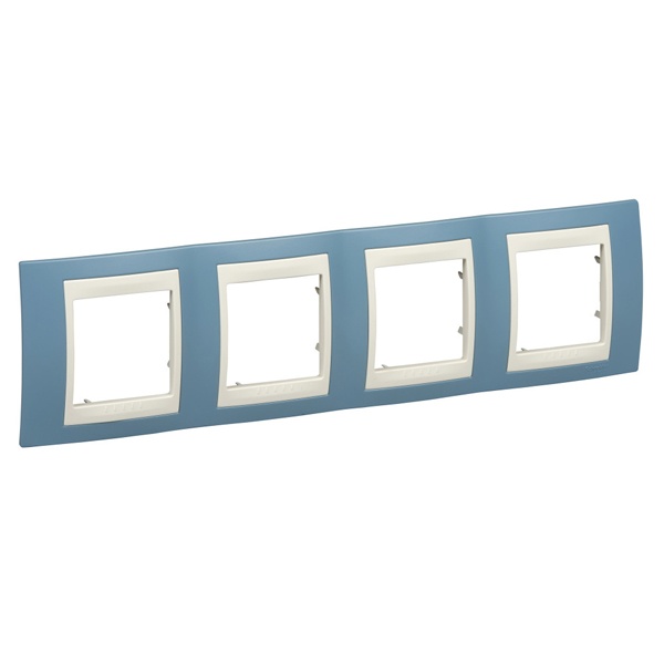 Рамка Schneider Electric UNICA ХАМЕЛЕОН (синий) четырёхместная с бежевой декоративной вставкой.