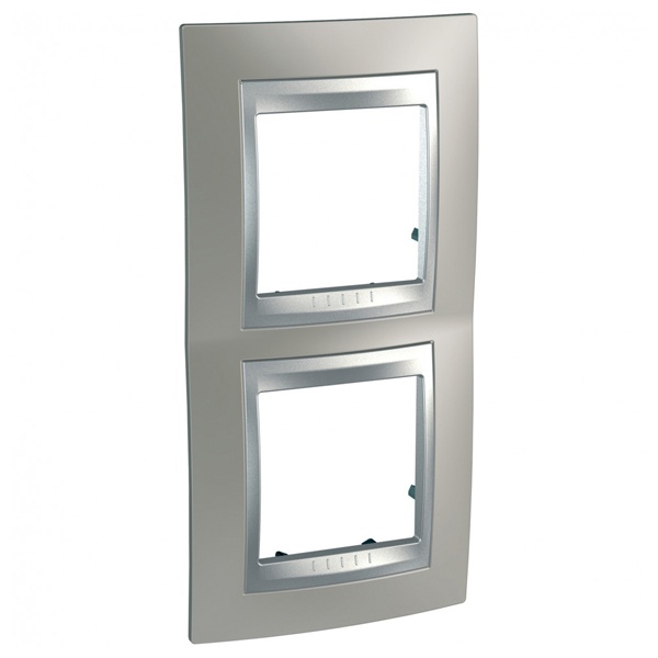 Рамка Schneider Electric UNICA TOP (никель) двухместная с алюминиевой декоративной вставкой. - Рамка для установки в вертикальном положении. - Позволяет гармонично вписать электроустановочное изделие в интерьер помещения и создать свой неповторимый дизайн.