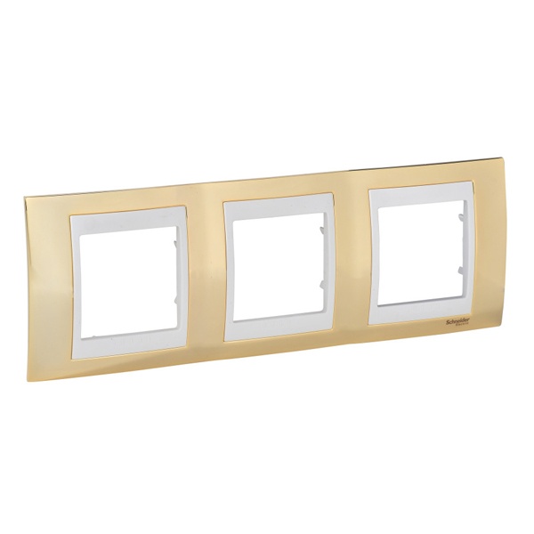 Рамка Schneider Electric UNICA ХАМЕЛЕОН (золото) трёхместная с бежевой декоративной вставкой.