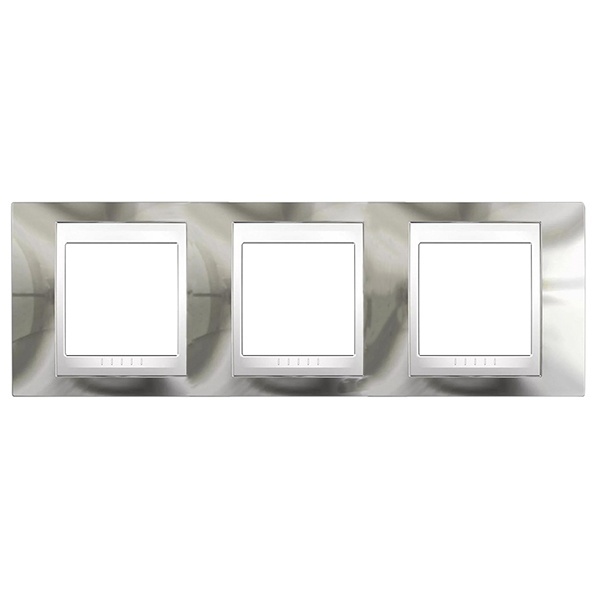 Рамка Schneider Electric UNICA ХАМЕЛЕОН (серебро) трёхместная с белой декоративной вставкой.