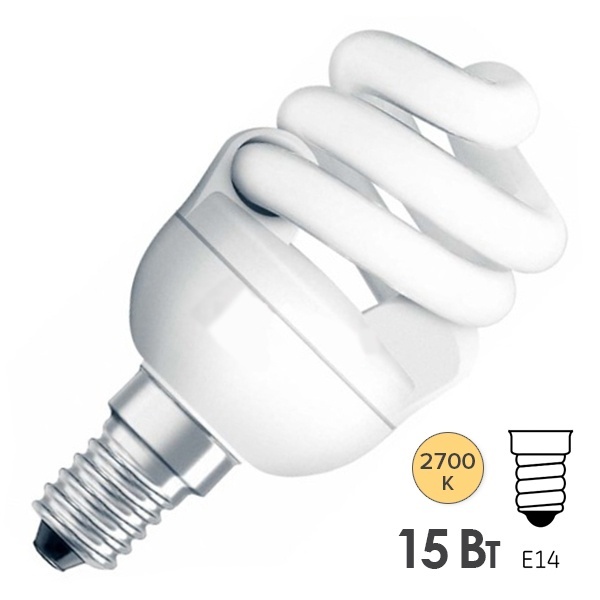 Компактная люминесцентная лампа OSRAM DULUXSTAR MICRO TWIST 15Вт, цоколь Е14 для замены ламп накаливания. Сокращение энергопотребления до 80% по сравнению с обычными лампами накаливания. Компактные размеры. Срок службы: до 8 000 ч. Содержит ртуть, требует специальной утилизации. Лицензиатом торговой марки OSRAM в общем освещении является компания LEDVANCE.