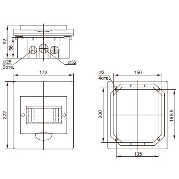 • Простое введение кабелей, проводов через выштампованные вводы для проводников на задней и боковых стенках корпуса.