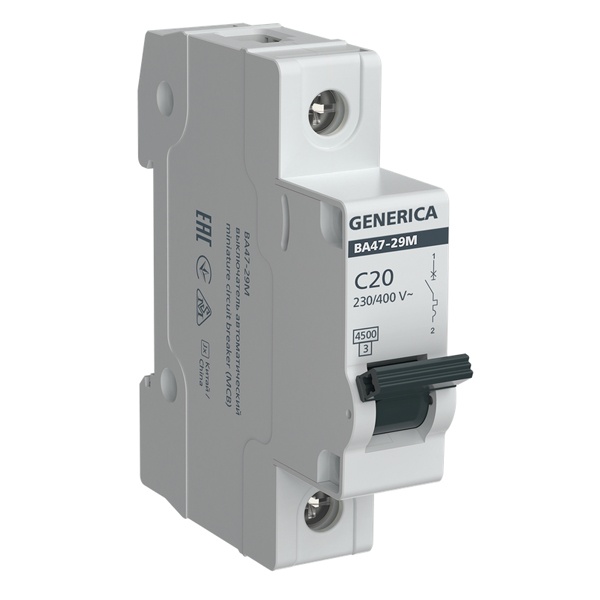 Модульный однополюсный электрический автомат Генерика ВА47-29 20 Ампер уставка C MVA21-1-020-C-G