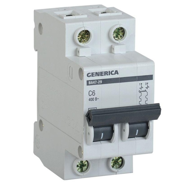 Известный производитель IEK представляет линейку модульного оборудования GENERICA, к которой относятся автоматы ВА 47-29 с характеристикой срабатывания С. Данная модель представляет собой компактный автоматический выключатель с 2 полюсами. Областью применения являются распределительные щиты многоквартирных домов и общественных зданий. Основная функция выключателя состоит в автоматическом отключении цепей при возникновении сверхтоков: короткого замыкания или токов перегрузки. Соответственно, он обеспечивает защиту электросетей от возможного перегрева. Токоограничивающее устройство с уставкой типа С рассчитано на напряжение сети переменного тока 400 Вольт. Оно подходит для нагрузки с небольшими пусковыми токами. Номинальный ток составляет 6 Ампер. Отключающая возможность соответствует 4,5 килоампера. Это сила тока КЗ, при которой оборудование может многократно отключаться, не выходя из строя. Механическая износостойкость составляет 20 тысяч циклов, коммутационная – 6 тысяч циклов. Внешне автомат заключен в корпус из качественного полиамида. На лицевой стороне присутствует увеличенный рычаг управления, который облегчает включение или отключение автомата. Имеется возможность соединения шиной PIN. Насечки на контактных зажимах снижают тепловые потери и увеличивают механическую устойчивость соединения. Габаритные параметры автомата: 35,6х81,5х78 мм.