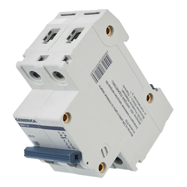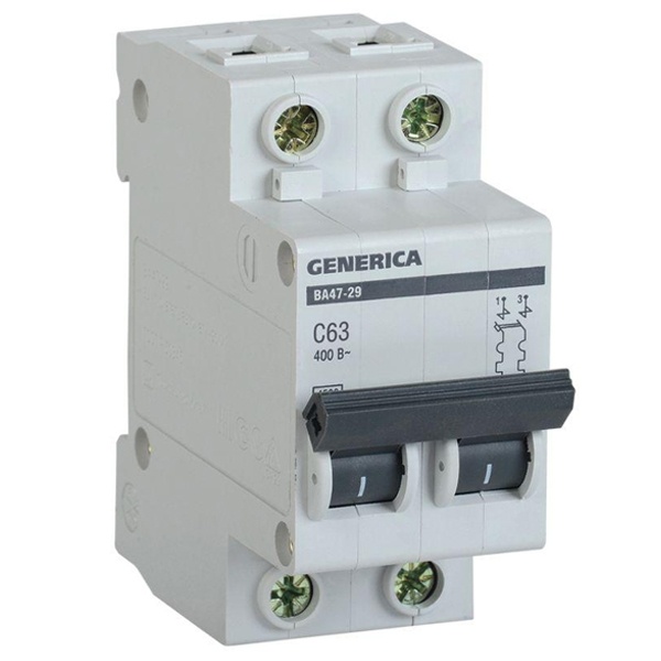 Автомат известной компании-производителя IEK относится к серии модульных агрегатов GENERICA. Это надежный и экономичный аппарат, который по своим характеристикам и цене доступен массовому потреблению. Он предназначен для комплектации систем электроснабжения на жилищных объектах и служит для коммутации электрических цепей с напряжением 400 Вольт в сети переменного тока. Он обладает защитной характеристикой типа С, подходящей для нагрузки с небольшими пусковыми токами. Отключающая возможность составляет 4,5 килоампера. Основная функция автомата состоит в защите цепи от короткого замыкания или токов перегрузки. Токоограничивающее устройство имеет 2 полюса и рассчитано на нагрузку тока в 63 Ампера. Крепится прибор на монтажную DIN-рейку и фиксируется в двух местах с помощью защелок. К его особенностям относят усовершенствованную дугогасительную систему, которая гарантирует увеличенный срок службы и повышенную устойчивость к токам короткого замыкания. Насечки на контактных зажимах снижают тепловые потери и увеличивают механическую устойчивость соединения. Имеется возможность соединения шиной PIN. Увеличенная рукоятка управления облегчает включение/выключение. Диапазон рабочих температур соответствует от -40 до +50 градусов Цельсия. Прочный монолитный корпус изготовлен из качественного пластика. Механическая износостойкость составляет 20 000 циклов, коммутационная – 6 000 циклов. Параметры автомата: 35,6х81,5х78 мм.