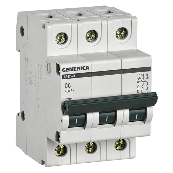 Модульный автоматический выключатель серии GENERICA от компании IEK представляет собой устройство нового поколения с множеством отличительных особенностей, среди которых: надежность, улучшенная дугогасительная камера, увеличенная рукоятка и долгий срок службы. Автомат создан для управления нагрузкой и защиты кабельных линий, находящихся под постоянным напряжением. Он реагирует на возникновение токов перегрузки и токов короткого замыкания и моментально разрывает цепь. Прибор с тремя полюсами имеет компактный размер шириной 3 модуля, крепится на стандартную DIN-рейку простым защелкиванием и не требует дополнительных затрат времени и сил. Работает в сети переменного тока с напряжением 400 Вольт. Рассчитан на номинальный ток 6 Ампер. Отключающая способность составляет 4,5 килоампера. Устройство можно встретить в распределительных щитах жилых домов, административных зданий и на объектах промышленности. Уставка типа С подходит для линий со стандартной нагрузкой. Имеется возможность соединения шиной PIN. Рычаг управления с двумя положениями I/O облегчает включение и выключение. Насечки на контактных зажимах снижают тепловые потери и увеличивают механическую устойчивость соединения. Корпус выполнен из качественного полиамида. Механическая износостойкость составляет 20 000 циклов, коммутационная – 6 000 циклов. Параметры автомата: 53,4х81,5х78 мм.