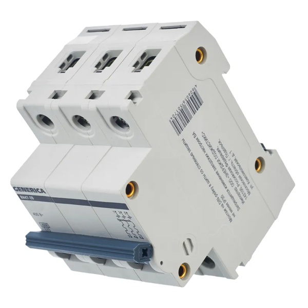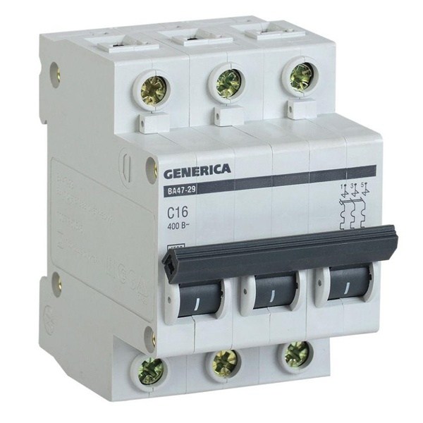 Автомат модульного типа производства известной компании IEK серии GENERICA предназначен для управления нагрузкой и защиты электрических цепей от сверхтоков: перегрузки и короткого замыкания. Принцип его действия состоит в мгновенном разъединение цепей при возникновении аварийных ситуаций. Поэтому он обеспечивает бесперебойную работу оборудования, находящегося под постоянной нагрузкой. Устройство обладает уставкой типа С, поэтому рекомендовано для защиты нагрузки с небольшими пусковыми токами. Автомат характеризуется отключающей способностью в 4,5 килоампера и работает в сети переменного тока с напряжением до 400 Вольт. Он рассчитан на номинальную нагрузку тока 16 Ампер. Изделие гарантирует надежную работу, высокую скорость срабатывания и долгий срок службы. Прибор можно встретить в распределительных щитах многоквартирных или частных домов, а также в промышленных зданиях и местах общественного назначения. Он оснащен 3 полюсами и крепится на монтажной DIN-рейке. Панель прибора оборудована двухпозиционным рычагом с поперечной планкой с положениями: I/O (включено/отключено). Корпус изготовлен из качественного пластика. Механическая износостойкость составляет 20 000 циклов, коммутационная – 6 000 циклов. Имеется возможность соединения шиной PIN. Насечки на контактных зажимах снижают тепловые потери и увеличивают механическую устойчивость соединения. Параметры автомата: 53,4х81,5х78 мм.