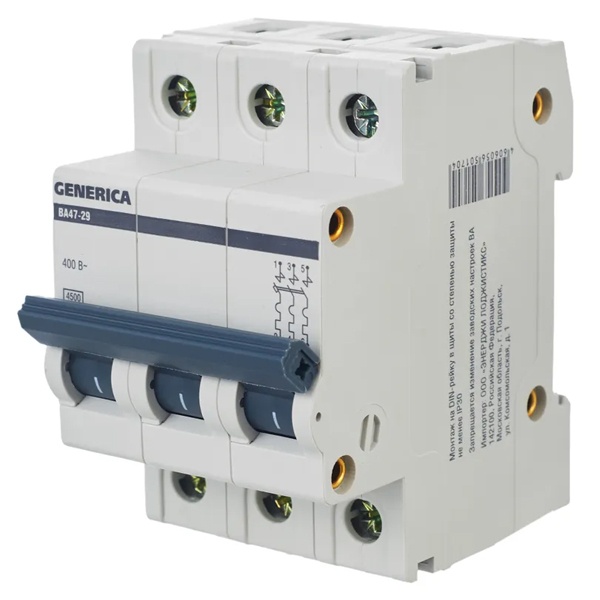 Автоматический выключатель серии GENERICA от компании IEK предназначен для управления нагрузкой, разъединения электрических цепей и их защиты от перегрузки и короткого замыкания. Прибор с 3 полюсами работает в сети переменного тока с напряжением 400 Вольт. Отключающая способность составляет 4,5 килоампера. Номинальный ток автомата 20 Ампер, характеристика типа С. Данное устройство можно встретить в распределительных щитах жилых домов, административных зданий и объектах промышленности. Уставка типа С подходит для защиты нагрузки с небольшими пусковыми токами. Корпус выполнен из качественного полиамида. С лицевой стороны есть увеличенный рычаг с двумя положениями: I/O, который облегчает управление. Установка производится на стандартную дин-рейку путем защелкивания с двумя фиксированными положениями. Механическая износостойкость составляет 20 000 циклов, коммутационная – 6 000 циклов. Улучшенная дугогасительная камера гарантирует увеличенный срок службы и повышенную устойчивость к токам короткого замыкания. Параметры автомата: 53,4х81,5х78 мм.