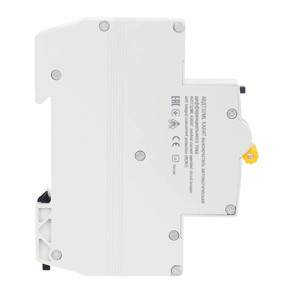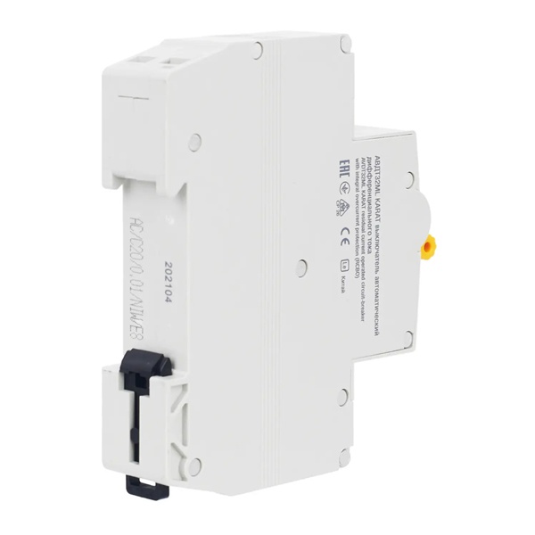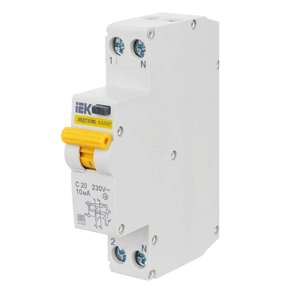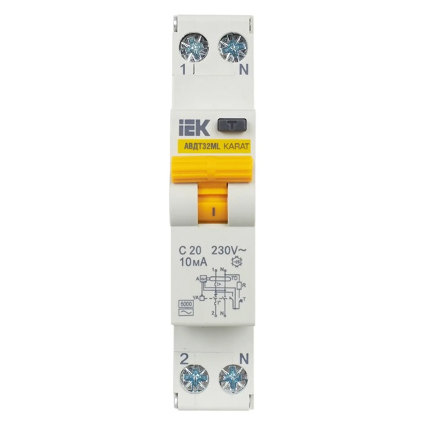 Дифференциальный автомат типа АВДТ32ML серии KARAT от производителя IEK представляет собой прибор со встроенной защитой от сверхтоков и токов утечки, который используется в однофазных электросетях переменного тока с частотой 50 Герц и напряжением до 230 Вольт. Он выполняет функцию обнаружения дифференциального тока, сравнения его со значением тока срабатывания и отключения защищаемой цепи в случае, когда дифференциальный ток превосходит это значение. Также с его помощью обеспечивается автоматическое отключение электроустановки при возникновении коротких замыканий и перегрузок. Таким образом, АВДТ защищает человека от поражения током в случае прямого прикосновения, и при косвенном контакте с доступными частями электроустановок при нарушении изоляции, а также от пожаров из-за тока утечки. Данная модель автомата рассчитана на номинальную токовую нагрузку 20 Ампер при допустимом значении отключающего дифференциального тока 10 милиампер. Прибор обладает высокой предельной коммутационной способностью 6000 Ампер с характеристикой срабатывания от сверхтоков типа C. Устройство имеет компактный размер шириной 1 модуль со степенью защиты корпуса от пыли и влаги IP20. Областью применения автомата являются распределительные щиты общественных, коммерческих и жилых зданий. Быстрый монтаж и демонтаж устройства производится на DIN-рейку.
