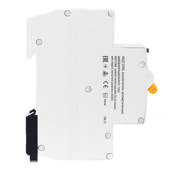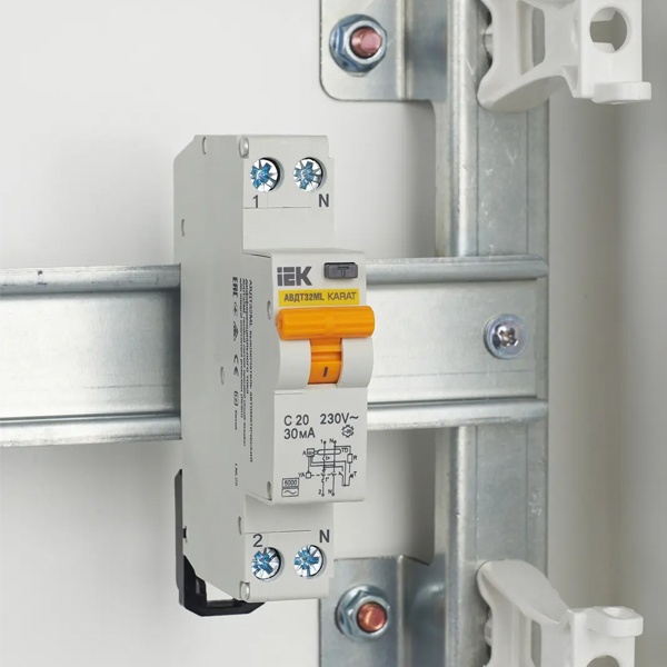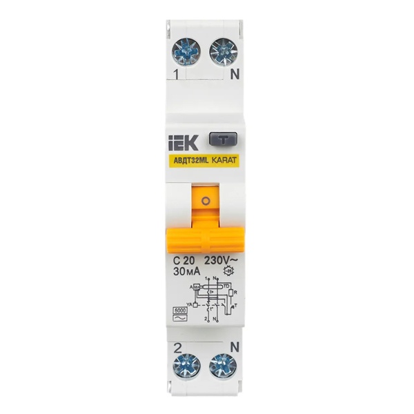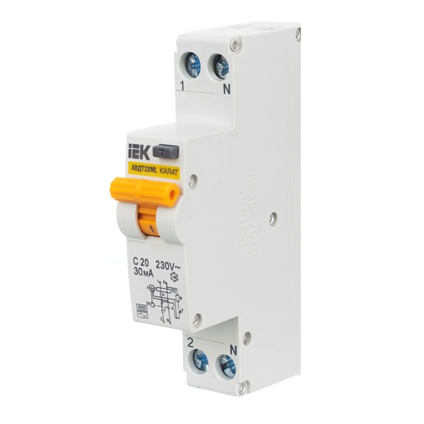Автомат АВДТ32МL серии KARAT известной торговой марки IEK представляет собой дифференциальный выключатель в одномодульном корпусе, предназначенный для защиты электрической сети от возникающих перенапряжений, коротких замыканий и тока утечки. Применение устройства допустимо в однофазных электросетях переменного тока с напряжением 230 Вольт и частотой 50 Герц. АВДТ данного типа используется в промышленной отрасли, жилом секторе и на коммерческих объектах. Он крепится на DIN-рейку в распределительный щит. Дифавтомат рассчитан на предельную токовую нагрузку до 20 Ампер и допустимый ток утечки 30 милиампер. Максимальная отключающая способность прибора составляет 6000 Ампер. Характеристика срабатывания от сверхтоков относится к типу C. Особенностью модели является наличие специально разработанной схемы подключения тестирующей цепи. Подключение нагрузки может быть произведено сверху или снизу устройства. Максимальное сечение входящего кабеля составляет 6 мм2. Прибор имеет 2 полюса, 1 из которых надежно защищен. Степень защиты корпуса IP20 предполагает размещение в сухом влагозащищенном месте. С помощью АВДТ обеспечивается безопасность человека от поражения током и оборудования от пожара при утечке тока и нарушенной изоляции токоведущих частей.