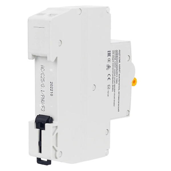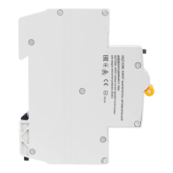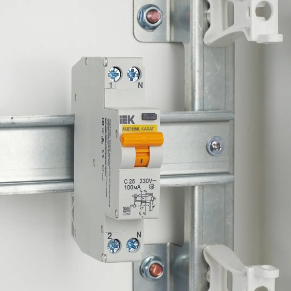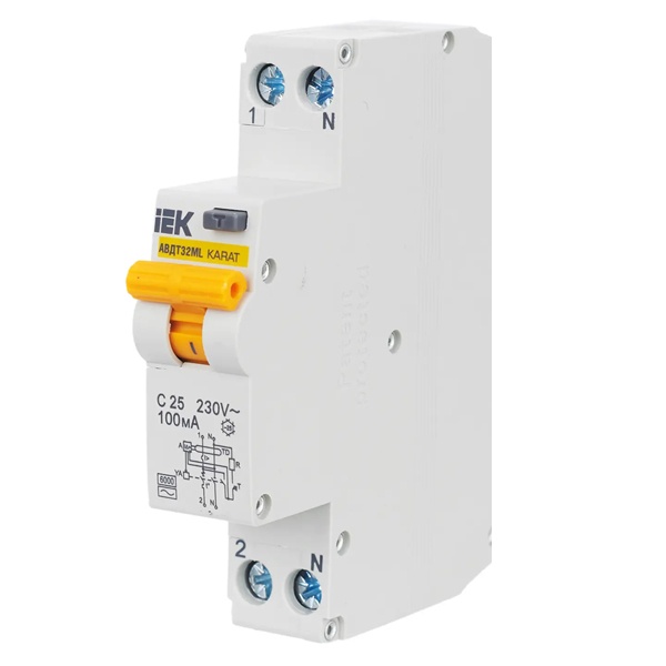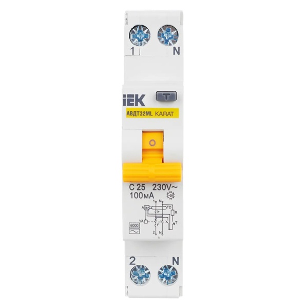 Автомат АВДТ32МL серии KARAT известной торговой марки IEK представляет собой дифференциальный выключатель в одномодульном корпусе, предназначенный для защиты электрической сети от возникающих перенапряжений, коротких замыканий и утечки тока. Применение устройства допустимо в однофазных электросетях переменного тока с напряжением 230 Вольт и частотой 50 Герц. АВДТ данного типа используется в промышленной отрасли, жилом секторе и на коммерческих объектах. Он крепится на DIN-рейку в распределительный щит. Дифавтомат рассчитан на предельную токовую нагрузку 25 Ампер и допустимый ток утечки 100 милиампер. Максимальная отключающая способность прибора составляет 6000 Ампер. Характеристика срабатывания от сверхтоков относится к типу C. Особенностью модели является наличие специально разработанной схемы подключения тестирующей цепи. Подключение нагрузки может быть произведено сверху или снизу устройства. Максимальное сечение входящего кабеля составляет 6 мм2. Прибор имеет 2 полюса, 1 из которых надежно защищен. Степень защиты корпуса IP20 предполагает размещение в сухом влагозащищенном месте. С помощью АВДТ обеспечивается безопасность человека от поражения током и оборудования от пожара при утечке тока и нарушенной изоляции токоведущих частей.