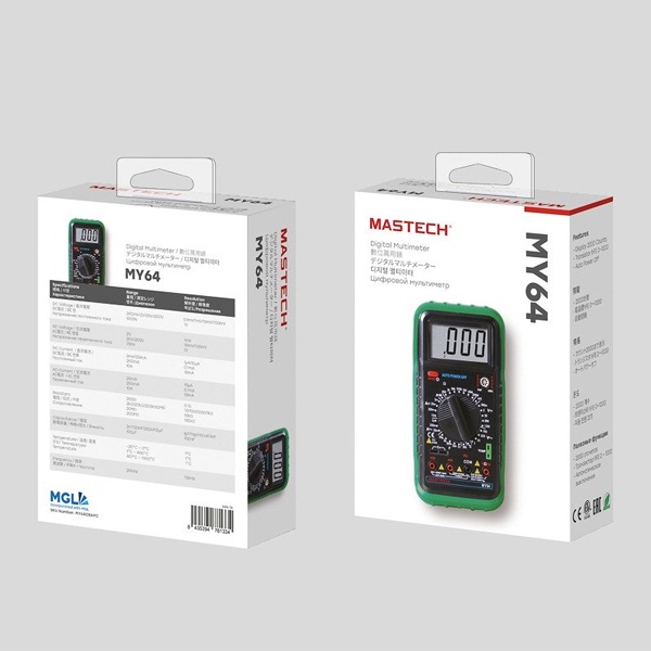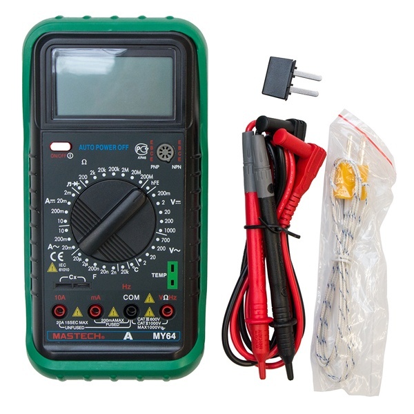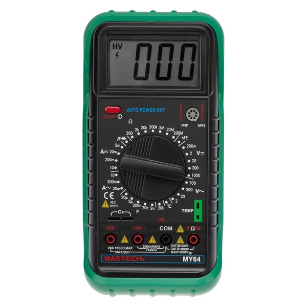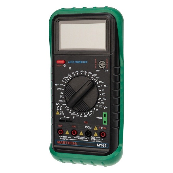 Цифровой мультиметр Mastech MY64 имеет богатый набор функций. С помощью него можно измерять величины силы постоянного и переменного тока, постоянного и переменного напряжения. сопротивления, коэффициента усиления биполярных транзисторов, емкость конденсаторов, температуру окружающей среды и частоту синусоидального сигнала в звуковом диапазоне. Высокое входное сопротивление не вносит погрешности при измерениях величин и говорит о высокой точности прибора. В приборе применен АЦП с измерением значений методом двойного интегрирования. Выбор пределов измерения величин производится вручную путем установки нужного положения многопозиционного переключателя.