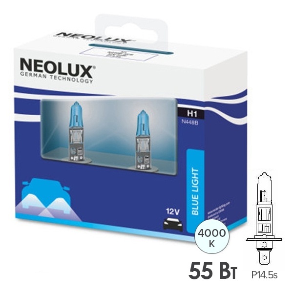 Автомобильные галогенные лампы головного освещения от известного немецкого производителя Neolux серии Blue Light, идущие в комплекте из 2 штук, обладают стильным голубовато-белым светом, близким к свету ксеноновых ламп. Устройства относятся к типу Н1 и имеют тип патрона P14,5s. Они предназначены для головного освещения легковых автомобилей и работают от бортовой сети 12 Вольт. Номинальная мощность каждого устройства составляет 55 Ватт. Колба лампы имеет синее покрытие. Холодный голубовато-белый свет обеспечивает лучшую видимость на дороге, что позволяет реагировать быстрее и дольше поддерживать высокий уровень концентрации внимания. Высокая контрастность ламп обеспечивает улучшенный обзор ночью и в неблагоприятных погодных условиях. Осветительные приборы имеют цветовую температуру 4000 Кельвинов, их световой поток равен 1550 Люменов. Эти лампы имеют срок службы 250 часов. Они имеют стильный внешний вид, обладают повышенным световым потоком, универсальны и компактны.