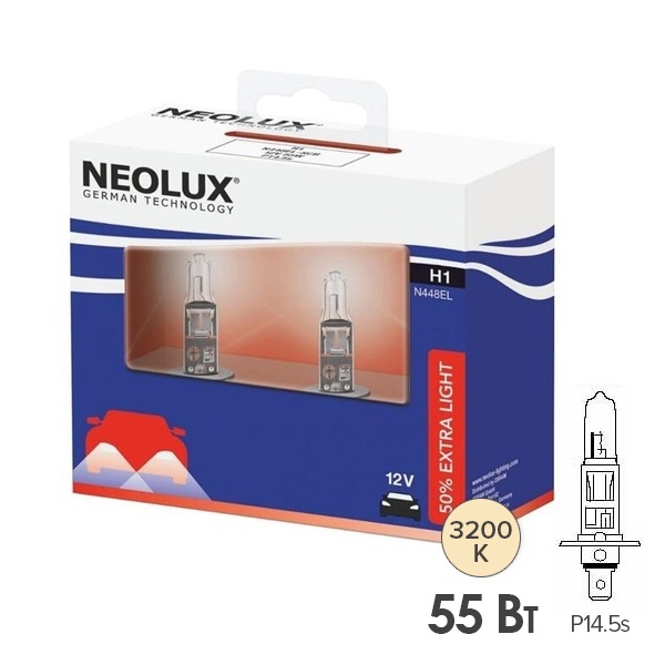 Высокотехнологичные галогенные лампы торговой марки Neolux серии Extra Light представляют собой набор источников света, которые обеспечивают до 50% больше яркости на дороге. Эти устройства относятся к типу H1 с патроном P14,5s фланцевого типа. Номинальная мощность каждой модели составляет 55 Ватт. Они работают от сети автомобиля 12 Вольт. Каждое изделие имеет следующие размеры: