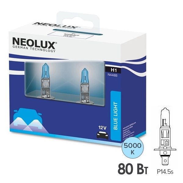 Комплект внедорожных галогенных ламп с улучшенными характеристиками бренда Neolux серии Blue Power Light представляет собой источники света категории Н1 с патроном Р14,5s. Они обладают высокой цветовой температурой 5000 Кельвинов и голубовато-белым светом. Лампы имеют повышенную мощность 80 Ватт и работают от бортовой сети автомобилей 12 Вольт. Они применяются для головного освещения внедорожных автомобилей в особо трудных условиях, таких как бездорожье, ралли, спасательные и строительные работы. Комплект надежен и долговечен, срок службы каждого изделия составляет 650 часов. Преимуществами этого набора являются улучшенная видимость, стильный вид, высокая контрастность и отменное качество от надежного производителя. Лампы не имеют сертификата ЕСЕ, поэтому могут использоваться только вне дорог общего пользования.