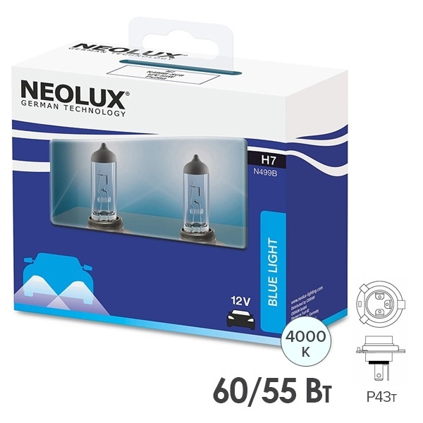 Галогенные лампы известного немецкого производителя Neolux серии Blue Light обладают стильным голубовато-белым светом, близким к свету ксеноновых ламп. Устройства относятся к типу Н4 с патроном Р43t. Они предназначены для головного освещения легковых автомобилей и работают от бортовой сети 12 Вольт. Номинальная мощность составляет 55 и 60 Ватт для разных режимов освещения. Колба каждой лампы имеет синее покрытие. Холодный голубовато-белый свет обеспечивает лучшую видимость на дороге, что позволяет реагировать быстрее и дольше поддерживать высокий уровень концентрации внимания. Высокая контрастность ламп обеспечивает улучшенный обзор ночью и в неблагоприятных погодных условиях. Осветительные приборы имеют цветовую температуру 4000 Кельвинов, их световой поток равен 1000 Люменов для ближнего света и 1650 Люменов для дальнего света фар. Срок службы ламп составляет 150 и 350 часов для каждой нити соответственно. Они имеют стильный внешний вид, обладают повышенным световым потоком, универсальны и компактны. Параметры каждого изделия следующие: