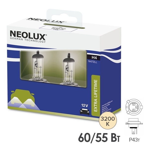 Автомобильные галогенные лампы нового поколения компании Neolux серии Extra Lifetime обладают повышенным сроком службы. Номинальная мощность каждого изделия составляет 55 и 60 Ватт для разных режимов работы. Они подходят для наиболее распространенных фар головного света легковых автомобилей с напряжением 12 Вольт. Эти источники света имеют две нити накала и относятся к типу Н4 и оснащены цоколем Р43t. Размеры каждого изделия следующие: