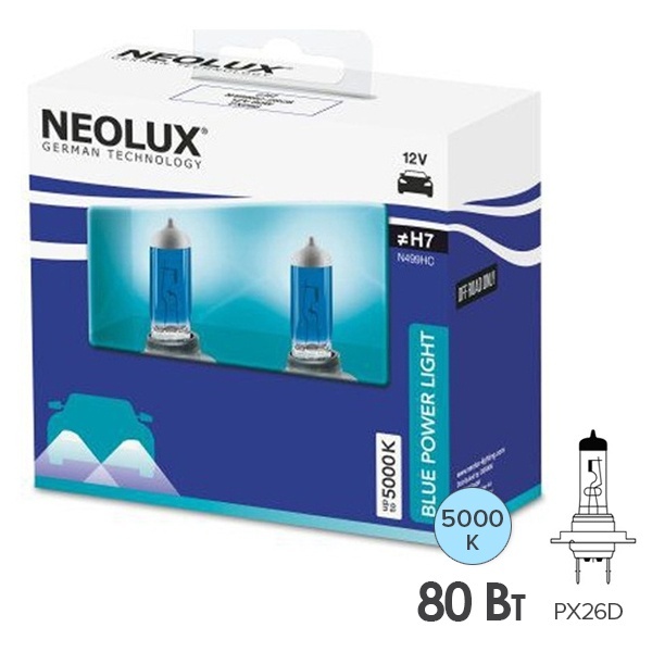 Высокотехнологичные галогенные лампы с повышенной мощностью торговой марки Neolux серии Blue Power Light предназначены для головного освещения легковых внедорожных автомобилей с бортовым напряжением 12 Вольт. Они относятся к категории Н7 с цоколем PX26d и имеют мощность 80 Ватт. Главным достоинством этих источников света является голубовато-белое холодное свечение с цветовой температурой до 5000 Кельвинов. Световой поток ламп равен 1500 Люменов. Они обеспечивают максимальную яркость и контрастное освещение даже в самых трудных условиях эксплуатации: область их применения охватывает спасательные, строительные и транспортные работы, а также сельское и лесное хозяйство. Благодаря применению качественных материалов и передовых технологий, эти лампы обладают повышенной прочностью и надежностью. Их срок службы равен примерно 550 часов. Изделия имеют следующие параметры: