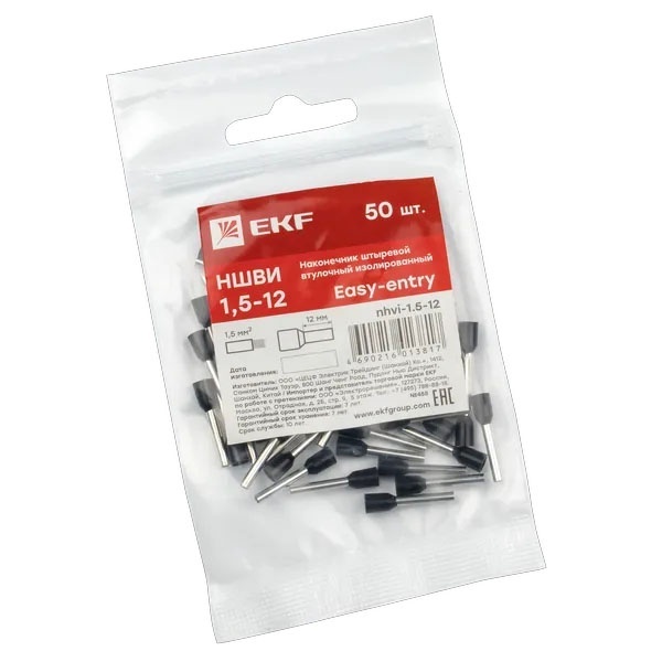 Одинарный наконечник штыревой втулочный изолированный НШвИ 1.5мм2 (50шт.) EKF nhvi-1.5-12