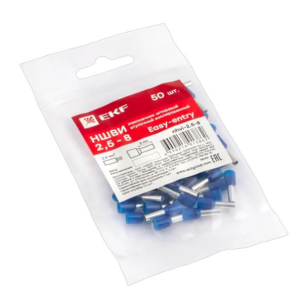 Наконечник штыревой втулочный изолированный EKF НШВИ 2,5-8 (50шт) nhvi-2.5-8